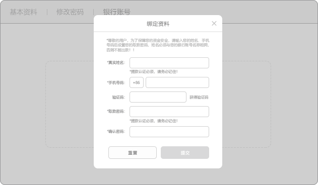 03填写您的真实姓名,手机号码,取款密码,点击 " 提交 " 即可提升账号的安全。